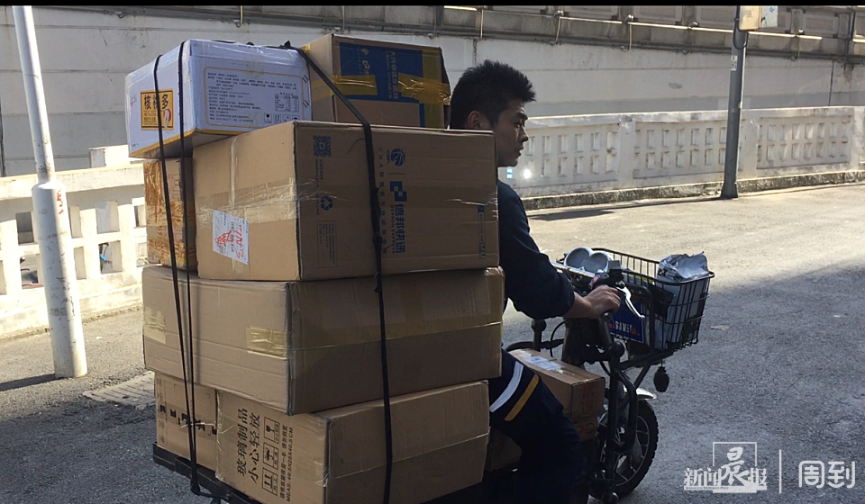 在营业部门口,记者看到,令狐家麻利地将5件家用电器“打包”上他的送货小电驴,货物约上百斤重,可以说是真正的负重前行。