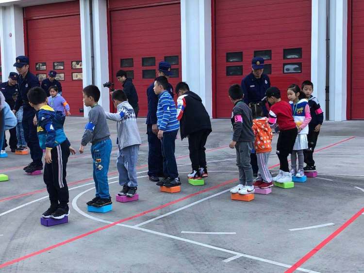 一早,小朋友们来到位于上海国际旅游度假区的川展消防中队,在“摸石过河”的游戏中,熟悉小组成员。