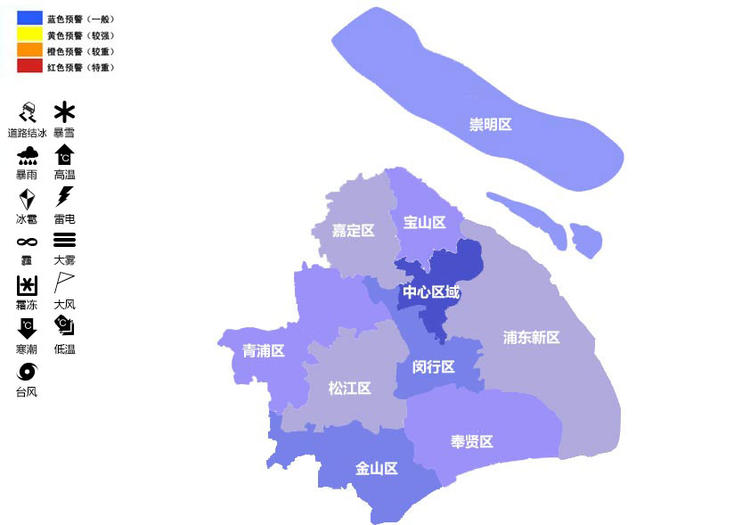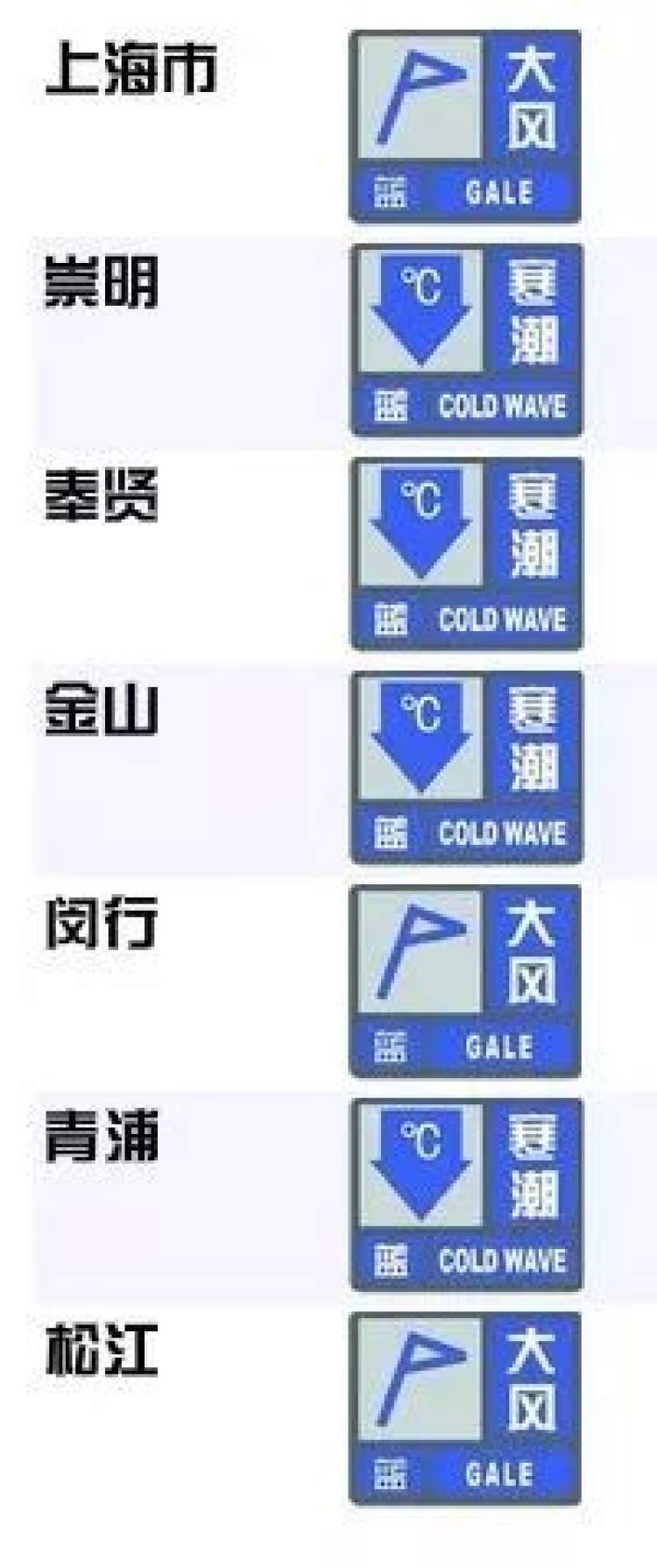 上海中心气象台17时00分发布大风蓝色预警信号,各区中崇明、奉贤、金山、青浦已发布寒潮蓝色预警信号。