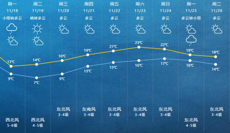 周三白天起逐日回温,周后期最低气温回到10℃以上,最高气温再度努力超过20℃。