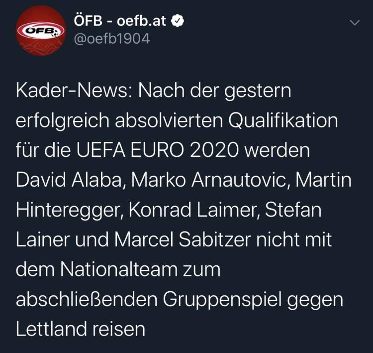 主场2:1战胜北马其顿队后的第二天,也就是北京时间周日晚上,奥地利足协通过官方社交平台宣布,包括拜仁慕尼黑球星阿拉巴、上海上港中锋阿瑙托维奇,还有萨比策、莱默、辛特艾格尔和拉伊纳这6名主力球员都将不会和球队一起前往格鲁吉亚客场,参加欧锦赛预选赛最后一轮的比赛。