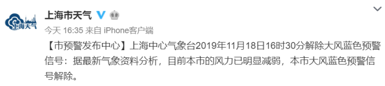 不过呢,昨天傍晚发布的大风蓝色预警信号终于在今天16点30分解除,本市的风力已明显减弱。
