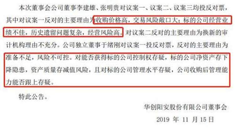 与华创证券力求拿下太平洋实际控制权相比,其母公司华创阳安没那么积极。22亿元股份转让协议披露当天,华创阳安公告称,该议案遭到公司9名董事中的3名反对。公司董事李建雄、张明贵和独立董事于绪刚认为此次股权收购风险不可控,对标的公司的资产质量和后续管理能力存疑。李建雄和张明贵均来自华创阳安第一大股东新希望系公司(李建雄为华创阳安副董事长、新希望集团CEO,张明贵为新希望集团四川总部总裁、新希望地产总裁);于绪刚为独立董事。
