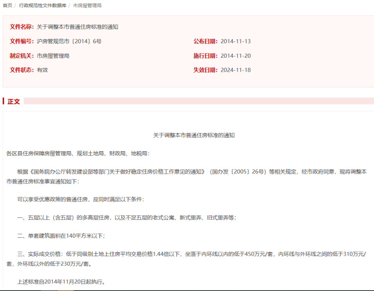 在该平台上,《上海市住房保障和房屋管理局、上海市规划和国土资源管理局、上海市财政局、上海市地方税务局关于调整本市普通住房标准的通知》(沪房管规范市〔2014〕6号),有效期延长至2024年11月18日。