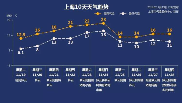 不过,24日夜里至25日上海又将迎来一次冷空气过程,届时最高温度又将降至14℃。最后提心大家,最近气温起伏变化比较大,要记得及时添减衣物哦~