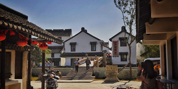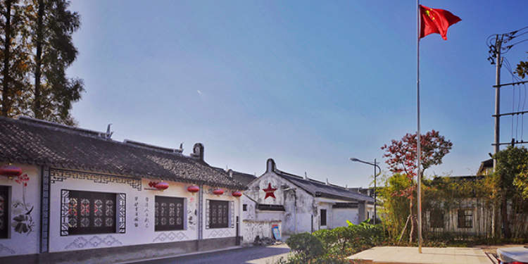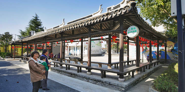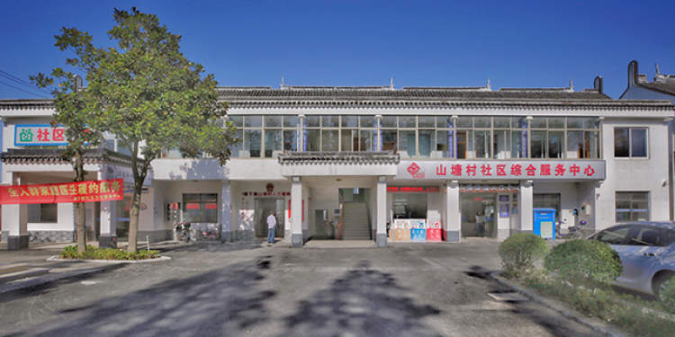 白墙黛瓦的水乡小楼,草木相间,亭台楼阁式的大舞台,村民们倚坐休息。如果不是一根立在广场上的旗杆和迎风飘扬的五星红旗,很难认出这里是金山区廊下镇山塘村村委驻地。村民沈阿婆在山塘村居住了50余年,和老伴开的副食品店就在距离村委不远的拐角处:“这里漂亮得像旅游景区。”