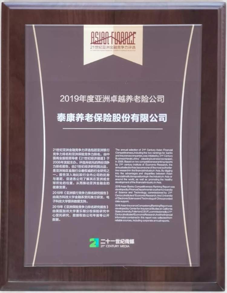 11月19日,“第十四届21世纪亚洲金融年会”在北京召开。会上由21世纪研究院金融研究中心出品、美国加州大学富乐顿分校风险管理与保险学院受托研发的《2019亚洲保险竞争力研究报告》显示,2018年,中国保持亚洲第一及世界第二大的保险市场,泰康人寿名列中国寿险十强第四,跻身亚洲寿险十强第八,泰康养老位列中国养老保险公司第二,较去年上升一位。在单项排名中,泰康人寿稳定性单项排名中国寿险公司第一。会上,泰康养老荣获2019年度亚洲卓越养老险公司,这也是泰康养老连续三年荣膺该奖项。