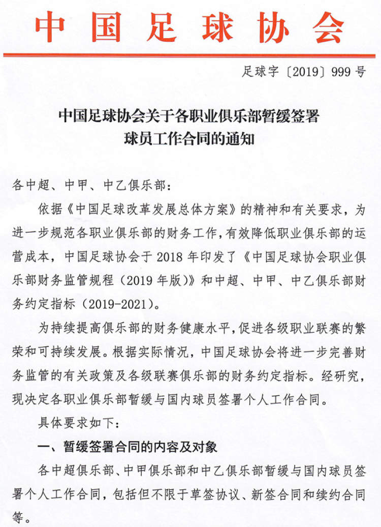 中国足协在通知中要求各中超、中甲、中乙俱乐部暂缓与国内球员签署个人工作合同。还特别提到了要,“进一步规范各职业俱乐部的财务工作,有效降低职业俱乐部的运营成本……持续提高俱乐部的财务健康水平,促进各级职业联赛的繁荣和可持续发展。”