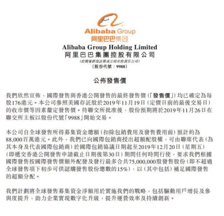 最新消息,阿里巴巴在香港二次上市,发行价定为176港元/股,发行5亿股,预计将筹资880亿港元。