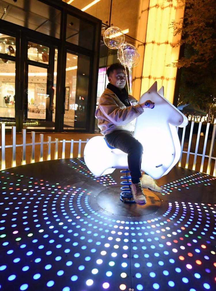 《“骑”乐无穷》是一个以弹簧马为主的充满趣味的互动装置。它由一个直径约4米的平台组成,平台中央是一匹会发光的小马,等待骑手的到来。这匹小马蓝白相间,和世界各地游乐场里的摇摇马相似。骑上它的时候,神奇的事情发生了:周围的环境发生了改变,平台上的灯光开始随着骑手摇摆的方向闪烁出彩色的光,为马和骑手在夜幕中创造了一个童话般的场景。
