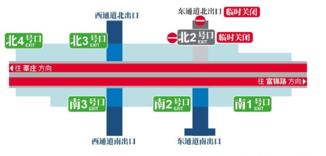 为配合轨交1号线莲花路商业广场项目施工,车站东通道北出口、北2口自11月20日运营结束后封闭施工,预计2020年3月底恢复使用。