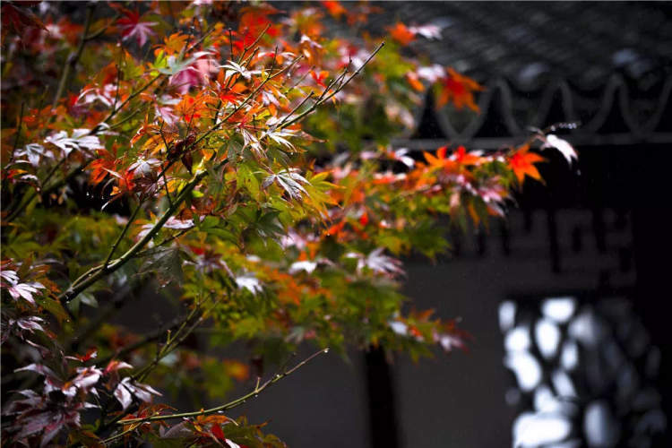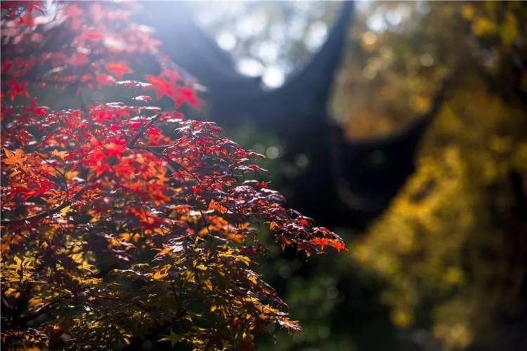 “像外之像,言外之意”即所谓意境,它是造园者内心情感、哲学理念的体现。为了让秋意更浓,色彩更加丰富饱满,今年,公园依旧保留了多处“落叶不扫”区域,如三孔桥和茗轩银杏林区域,让游客尽情欣赏“尽带黄金甲”的壮丽景观,再如鸳鸯湖南侧靠近石马区域,自然式栽植的青枫和红枫,让落叶区域更显浪漫和风雅。羽毛枫与鸡爪槭喜阳,红彤彤的色彩与淡雅的飞檐斗角在阳光下自成景观,投射在洁白的墙面,散落在地面上,秋景瑰艳,尽寒霜色流丹。