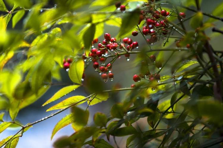 此外,火红的南天竹果、枸骨果,金黄的苦楝果、柚子、桔子,展现出秋日之硕果累累。