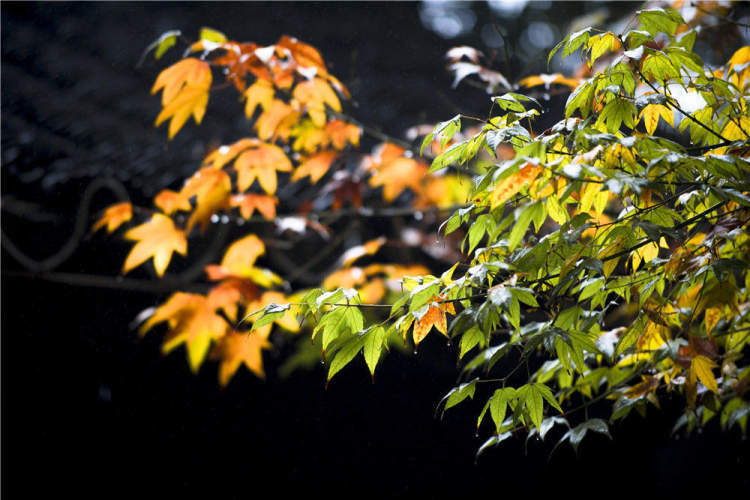 茗轩茶室前高大魁梧的百岁古银杏下,上层的黄叶、中层的红枫和下层的茶花交织错落、相互映衬,穿行于瓦片小径上,移步异景,秋色的魅力尽显。