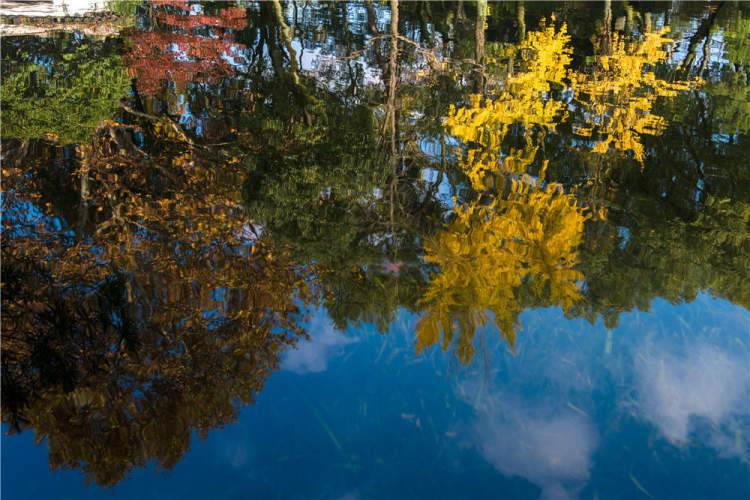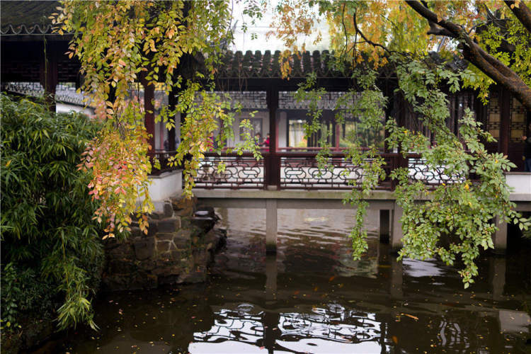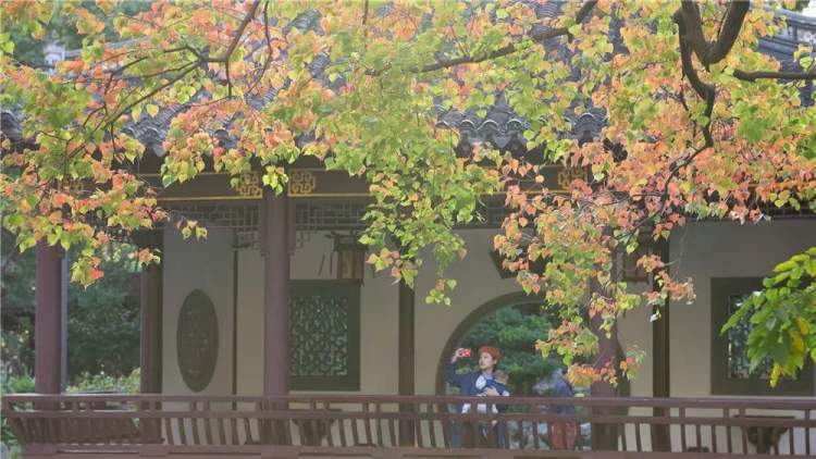 在选择和种植色叶树时,古猗园更注重因地制宜,水杉、池杉、落羽杉适宜在水边,乌桕、苦楝斜倚在水边,更呈现色彩斑斓的倒影,有红有黄、有深有浅、有浓有淡、有疏有离,如万花筒一般变幻着的美丽。黄色的有银杏、苦楝、悬铃木、榆树、无患子、栾树、马褂木等树种,深黄浅黄褐黄;红色的有乌桕、红枫、鸡爪槭、羽毛枫、紫叶李等。从初秋到深秋,色彩浓淡变幻,你方唱罢我登场;褐色的有落羽杉、水杉、池杉、榉树等,深深沉沉的褐色在光影效果下,呈现一线幻光。