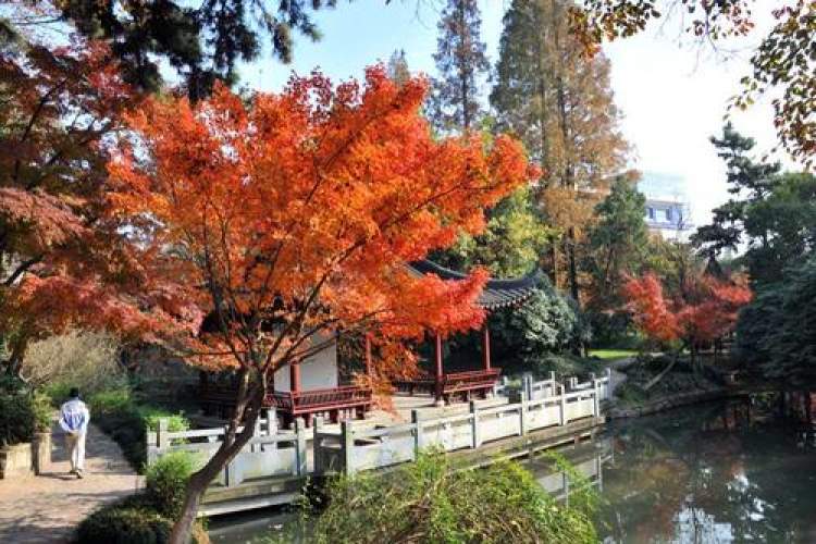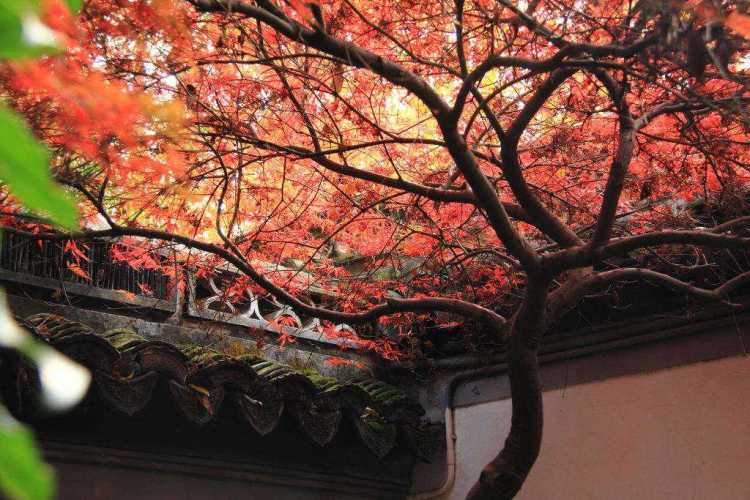 沿着小径走进这座江南园林,庭院楼阁与枫叶交相辉映。红叶倒映水中,别有一番韵味。