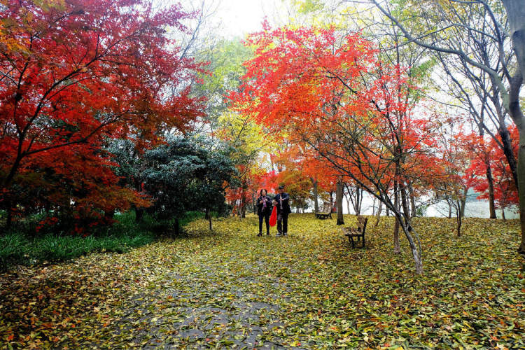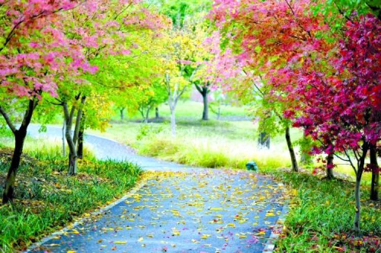 枫香、日本红枫、三角枫、鸡爪槭等树木的红,水杉、池杉等杉树的赭红,雪松等常绿树的绿,把这个季节的共青森林公园变成了一个缤纷的调色板,使得大森林层林尽染。