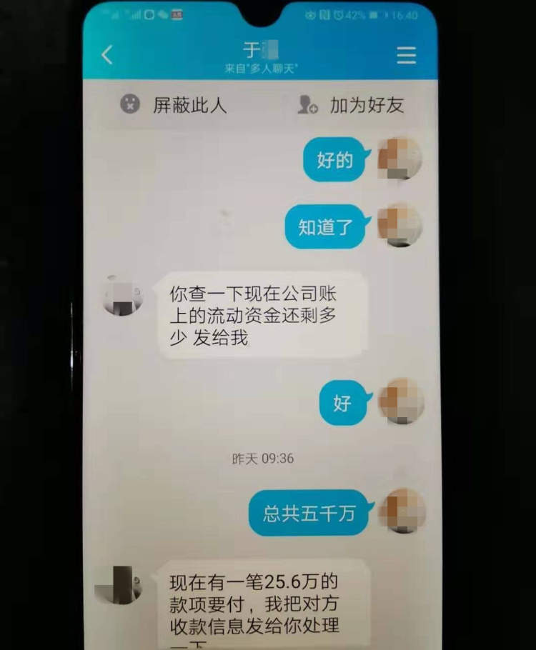 不多久,QQ聊天页面上又跳出一个与朱某公司老板“于某”同名同姓的QQ号与其联系。这名“老板”在聊天时,确认了之前广州科技公司要转账的事宜,这使朱某对其身份深信不疑。