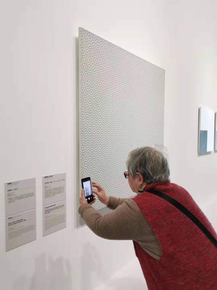 一位奶奶专注地拍展品,和老伴儿一块来的