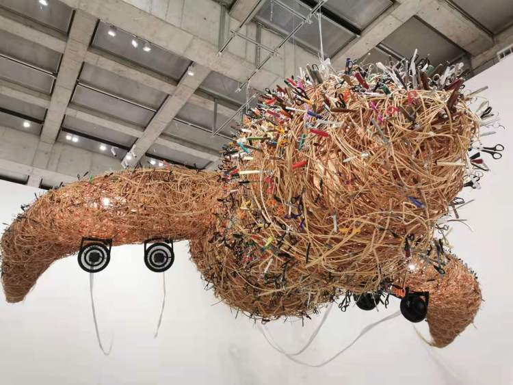 蔡国强回收利用了从圣保罗机场没收的利器,用枝条和竹子编织骨架,做成了这个飞机状的装置。