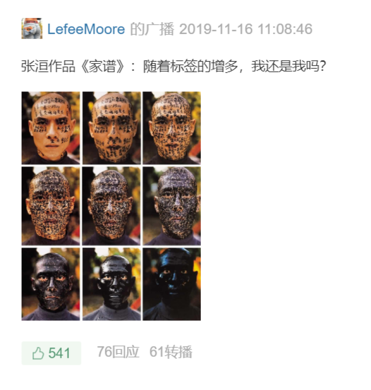 豆瓣这个话题点赞第二的便是张洹的《家谱》↓