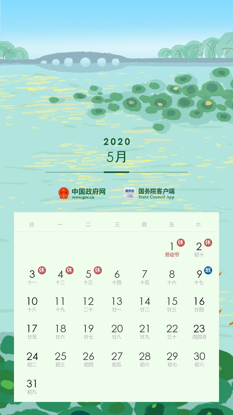 国定:5月1日至5日放假调休,共5天。4月26日(星期日)、5月9日(星期六)上班。