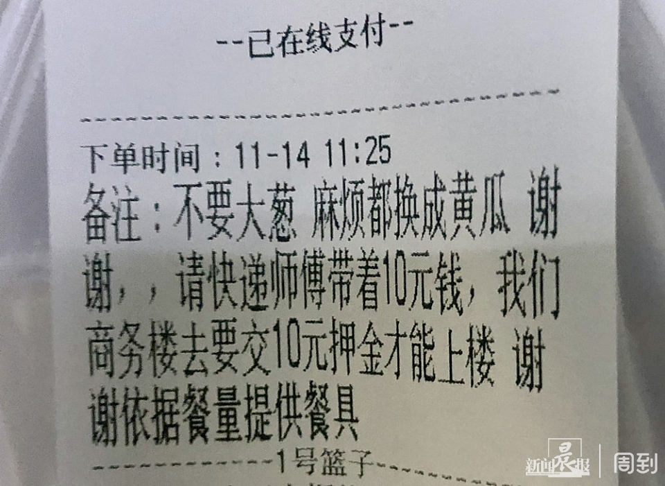 在一份外卖订单的纸上,一位点外卖的人还特地备注留言道:“请快递师傅带着10元钱,我们商务楼要交10元押金才能上楼,谢谢。”