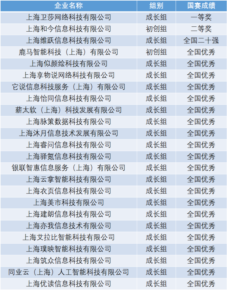据悉,本次第八届中国创新创业大赛互联网行业总决赛,上海共有48家互联网企业入围,参赛项目的创新应用涉及AI+文创、教育、旅游、营销、健康、农业等领域。最终,上海共有24家企业荣获第八届中国创新创业大赛优秀企业奖,其中3家企业成功晋级行业总决赛,入围全国二十强。
