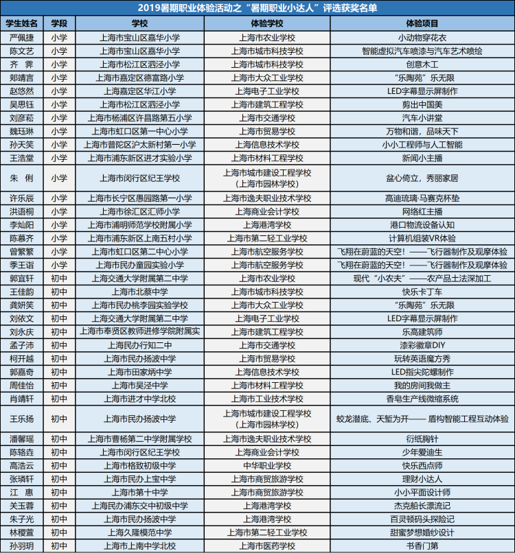走入第七个年头的上海市学生暑期职业体验日活动,正以“渐入佳境”的姿态,获得了全社会的肯定。今年初,国家颁布的《国家职业教育深化改革实施方案》中明确鼓励中等职业学校联合中小学开展劳动和职业启蒙教育,将动手实践内容纳入中小学相关课程和学生综合素质评价。根据《上海市初中学生社会实践管理工作实施办法》,初中学生社会实践主要评价内容由参加社会考察、公益劳动、职业体验和安全实训等综合实践活动组成,职业体验成为上海初中学生学习生涯的重要组成之一。