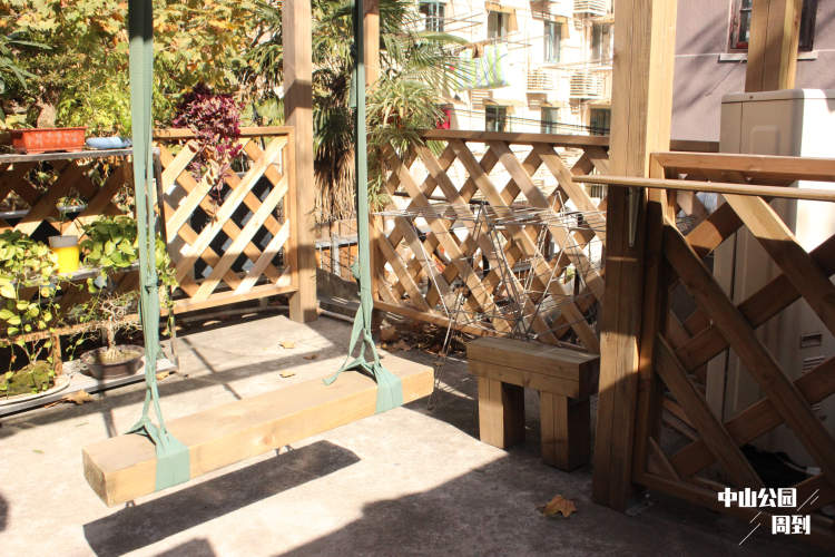 想必很多人每次路过都会觉得这家店又小又不起眼,但实际上内里别有洞天。跟着咖啡师天星拾级而上,楼上还有几间房间。除了有跟楼下雷同的三五好友坐下闲聊的小桌区域,挂墙的书架平添了一份安宁。还有几间房间适合娱乐活动,有更大的区域和空间。再往上走,阳台上布置有一个木质秋千架,夏天看星星,冬天晒太阳;近观能看到附近的幼儿园和居民区,远眺高楼大厦仿佛近在咫尺,有着市中心区车水马龙少有的安静。