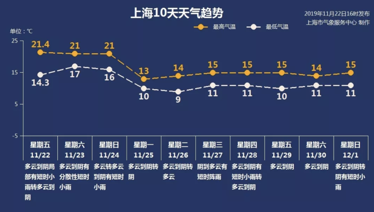 下周一,申城的气温“高台跳水”,最高气温仅有13℃,最低气温仅有10℃,郊区更低。之后气温略有回升,但整周的最高气温都很难突破15℃,气温明显较这几天下探一个台阶。