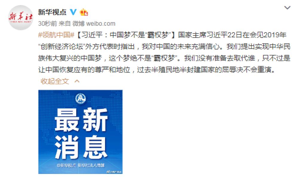 习近平:中国梦不是“霸权梦” 2019-11-22 来源:新华视点微博 【习近平:中国梦不是“霸权梦”】国家主席习近平22日在会见2019年“创新经济论坛”外方代表时指出,我对中国的未来充满信心。我们提出实现中华民族伟大复兴的中国梦,这个梦绝不是“霸权梦”。我们没有准备去取代谁,只不过是让中国恢复应有的尊严和地位,过去半殖民地半封建国家的屈辱决不会重演。 编辑:侯帮兴 赞一个 (0)