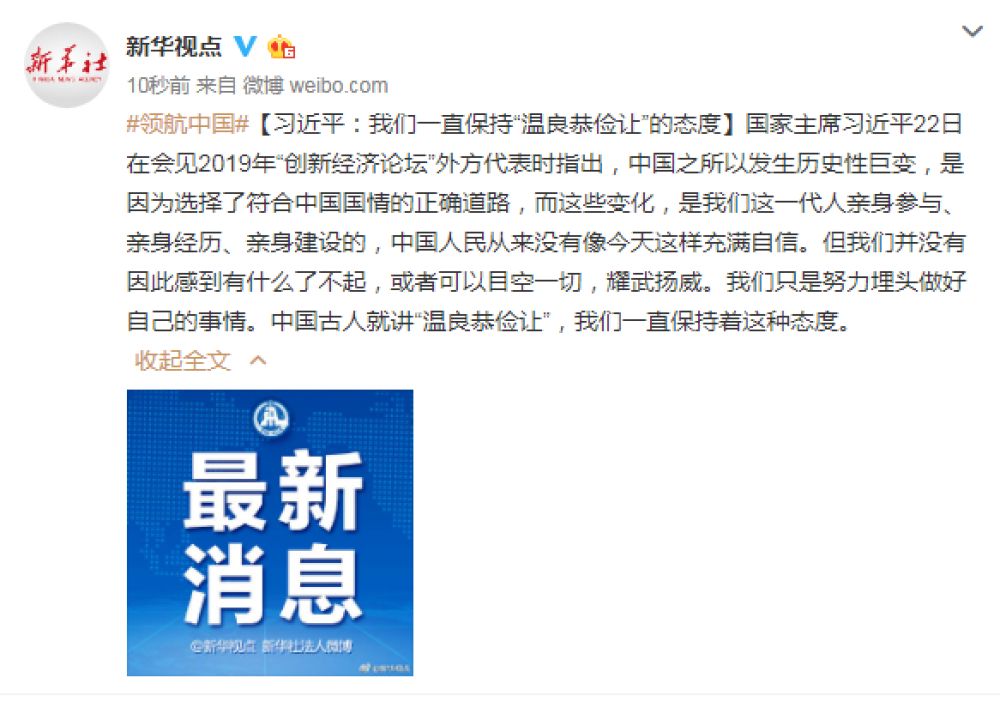 习近平:我们一直保持“温良恭俭让”的态度 2019-11-22 来源:新华视点微博 【习近平:我们一直保持“温良恭俭让”的态度】国家主席习近平22日在会见2019年“创新经济论坛”外方代表时指出,中国之所以发生历史性巨变,是因为选择了符合中国国情的正确道路,而这些变化,是我们这一代人亲身参与、亲身经历、亲身建设的,中国人民从来没有像今天这样充满自信。但我们并没有因此感到有什么了不起,或者可以目空一切,耀武扬威。我们只是努力埋头做好自己的事情。中国古人就讲“温良恭俭让”,我们一直保持着这种态度。 编辑:侯帮兴 赞一个 (0)