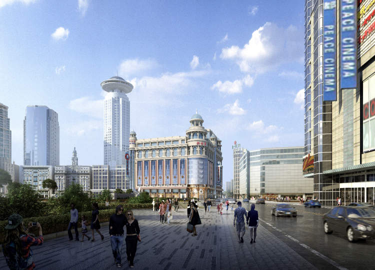 建筑外立面采用了美国ART-DECO的建筑艺术装饰风格,体现经典与时尚的碰撞,幕墙玻璃用金色线条勾勒出“商业帝国大厦”的辉煌。门厅采用了美国设计师的设计理念,以参天大树为背景,在自然中彰显出大气。透过玻璃幕墙从商场内部向外看,上海原点中心风貌区一览无遗,对面人民公园的葱翠绿树尽收眼底,这里将成为南京东路步行街上最佳观景地。