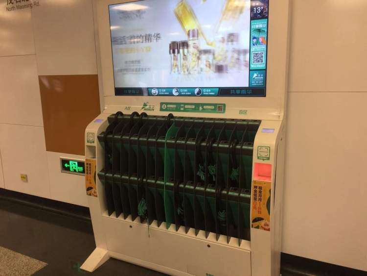 23日,在上海轨交12号线南京西路站站台大厅内,摆放着一组共享雨伞的租借设备。该设备共有48个雨伞槽,因为当天上海只有零星小雨,所以只有11把共享雨伞处于被借状态。