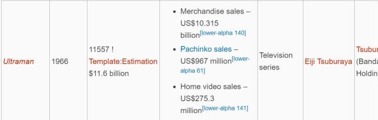 ■在全球最赚钱的IP榜单上,奥特曼排名44。