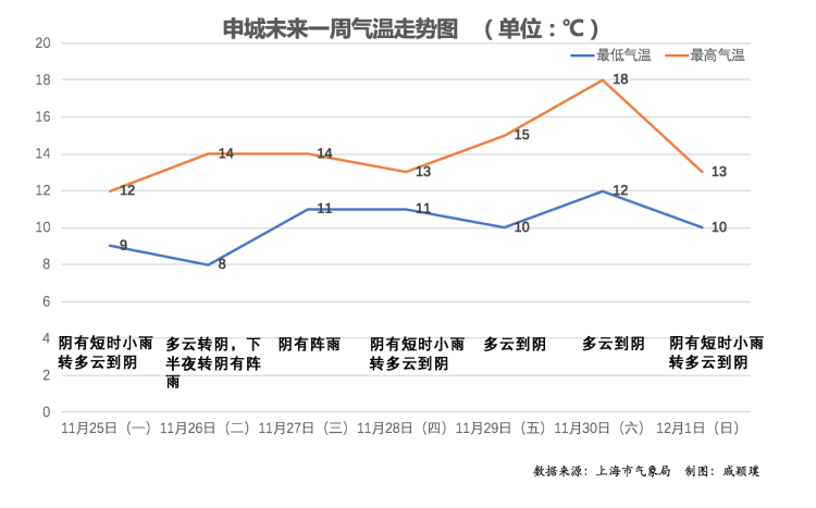 从本周四开始,上海迎来小幅度回暖。本周六达到回暖巅峰——18℃。然后又要迎来一波“俯冲”降温……预计下周,上海最低温又要下探,冬天真的不远了。