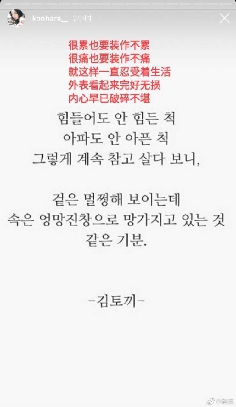 她在INS上的一段话,让内心的残破不堪昭然若揭:“很累也要装作不累,很痛也要装作不痛,就这样忍受着继续生活。”