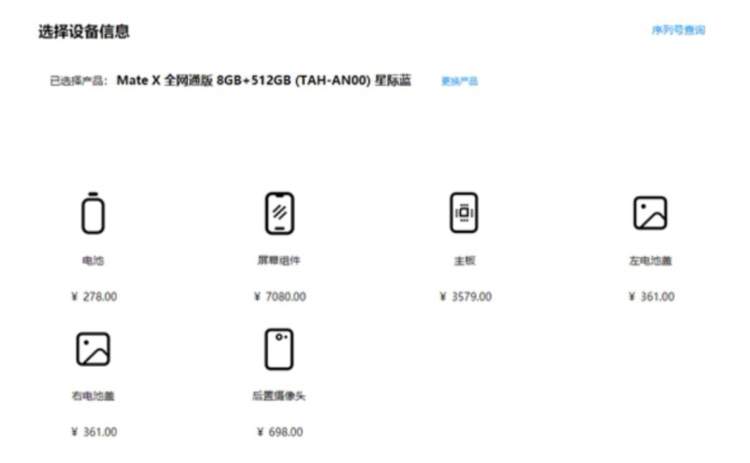 此前不久,华为还公布了Mate X的维修备件价格。其中屏幕组件最贵,价格高达7080元。日常更换电池也需要花费278元。其主板定价为3579元,左右电池盖单个均达到361元。