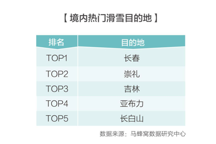 在目的地选择上,冰雪资源丰富的东北地区是中国游客最向往的滑雪目的地,关注度最高的5个目的地中,有4个位于东北地区。此外,拥有众多雪场且毗邻北京的崇礼也榜上有名。
