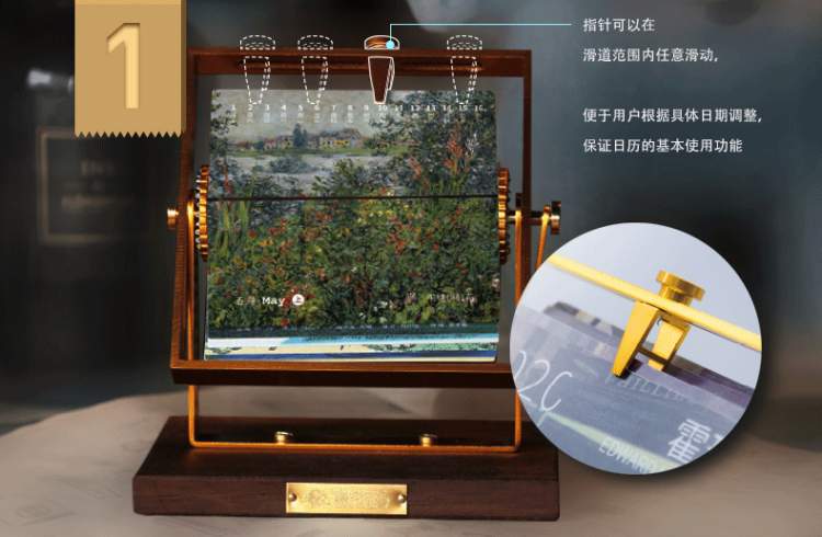 调节指针在滑道中滑动,对准日期。每半个月转动右侧摇臂,翻转日历叶片。快速手摇,可以使画面形成动画。