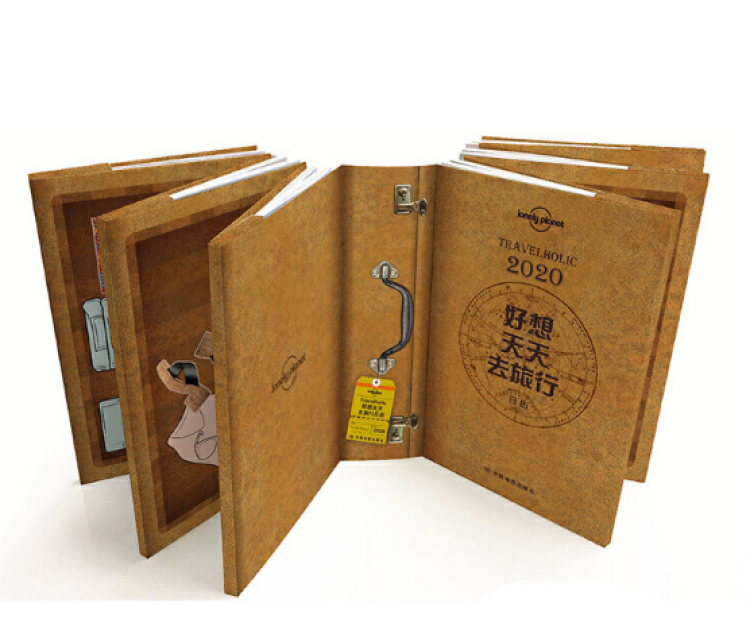 一本日历是一个旅行箱,旅行箱里是12本日程本,用风琴折收纳。