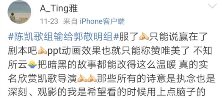 拿上期上了热搜的“郭敬明组赢了陈凯歌组”来说,在导演互拍环节,郭敬明《悲伤逆流成河》的烂本子经陈凯歌改编后,一下子拉升了n个档次。