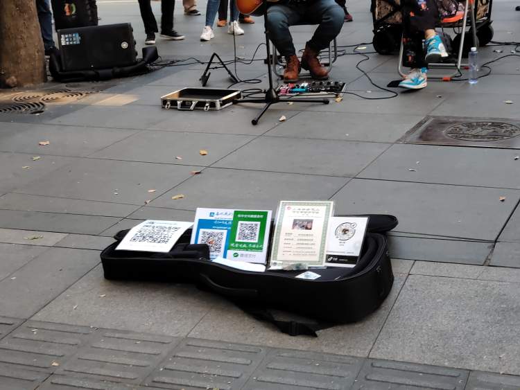 吉他盒里还有更重要的东西——必须出示的“上海街头艺人节目审核许可证”、支付宝和微信的付款码以及几个乐队粉丝群的二维码。