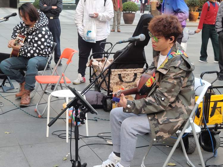 后来,付淳羽了解到,在国庆等节日期间,行业协会会希望街头艺人们唱《我和我的祖国》之类的红歌,“我是很愿意去配合做一些增加节日氛围的工作。”不过,为了唱得更有意思一些,乐队会在编曲上做一些改编。
