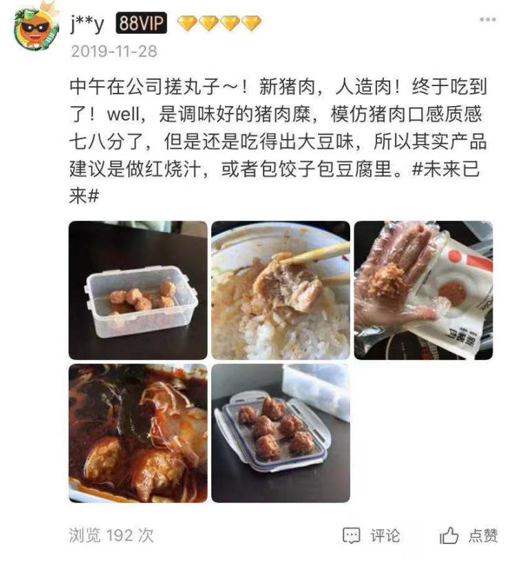 在这些评价中,周到君看到一句“未来已来”,而这也代表了一部分人对人造肉这类“未来食品”的肯定与期待。