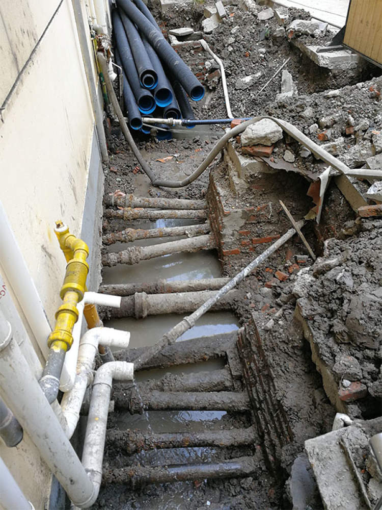 加梯自管小组提出,借此次加装电梯的机会对地下管道进行更换和重新布置,彻底消除下水管道堵塞的隐患。经讨论,大家认为如果单独开挖21号楼的管线,将来22号楼、23号楼如果需要加装电梯时,存在反复破土动工的麻烦,在费用上三个楼组一起做也比单独做更划算。