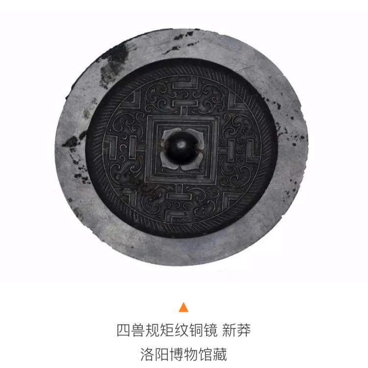 在这类铜镜上,一般都用青龙、白虎、朱雀、玄武四兽做图案装饰,所以也称规矩四神镜。这时期在镜缘上有着复杂的装饰,有锯齿纹、卷云纹或卷草纹等。由于方与圆的对比,形成了一个优美的图案结构。