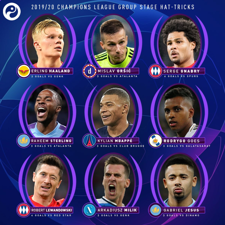 当然,出现这些进球盛宴也倚靠着不少射手的超神发挥,据欧足联官方统计,有多达9名球员至少在单场打入了三球,其中,莱万和格纳布里更完成了大四喜的成就。