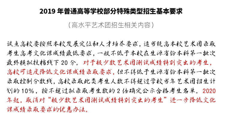 不过,教育部在2018年所发布的要求中,已经时明确了自2020年起,取消对“极少数艺术团测试成绩特别突出的考生”进一步降低文化课成绩录取要求的优惠办法。